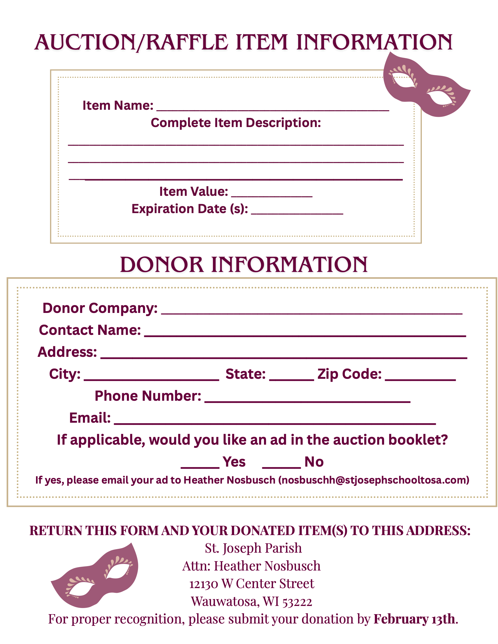 St. Joseph's 2026 Dinner Auction is set for Saturday, March 7, in the Parish Hall and Gym, with a masquerade theme.
